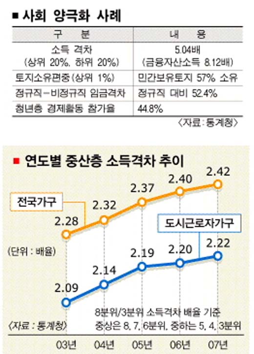 노동시장 양극화도 갈수록 심각해지고 있다. 통계청에 따르면 비정규직은 2003년 460만명으로 전체 임금노동자의 32.6%를 차지했지만 올해엔 570만 3000명(35.9%)으로 4년새 110만명 가량 늘어났다.