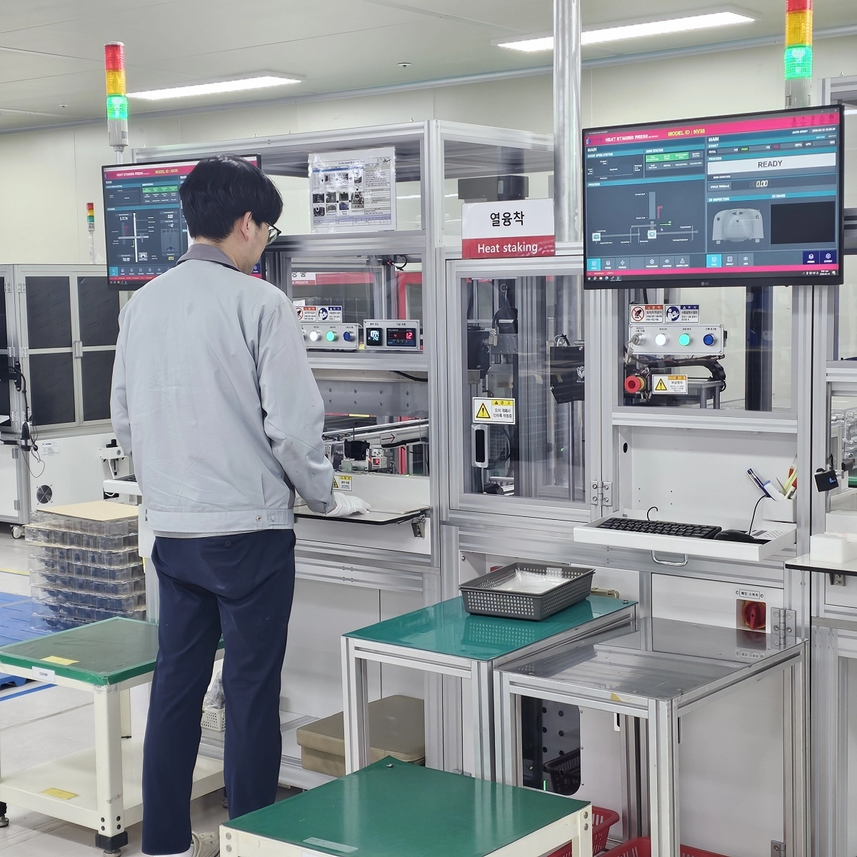 유아이엘의 한 직원이 경기 파주시 공장에서 신형 카메라 자동차 부품을 자동화 설비로 조립하고 있다.