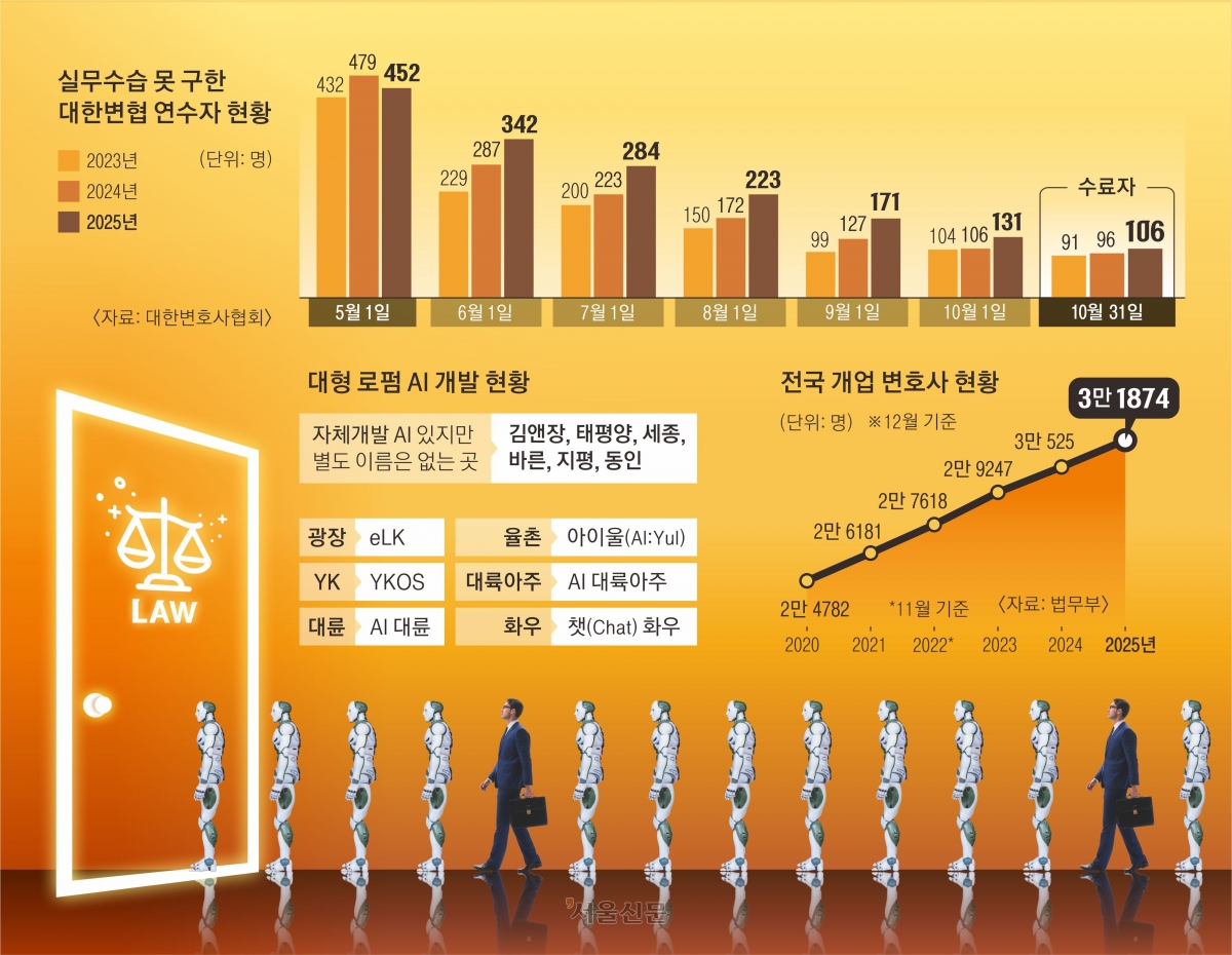 AI로 인한 고용 한파는 로스쿨에도 번지고 있다. 지난달 제15회 변호사 시험을 치른 정모씨는 실무수습을 준비하고 있다. 지원서를 제출한 곳만 40곳에 달하지만, 아직까지 합격 통보는 받지 못했다. 정씨는 “취업은 커녕 실무수습도 쉽지 않다”며 “최근에는 돈을 내고 소형 로펌에서 연수를 받는 경우도 있다”고 귀띔했다.