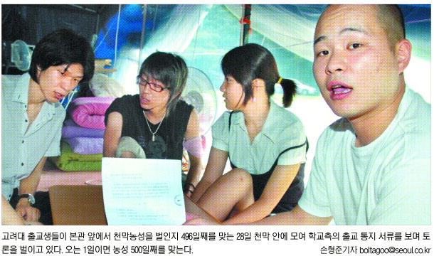 고려대 사제지간에 법정다툼이 한창이다. 고려대 학생 7명은 지난해 4월 출교처분을 받자 학교를 상대로 ‘출교처분무효확인 소송’을 냈고, 이날 법정에서는 2차 심리가 열렸다. 학생들이 다시는 학교에 돌아올 수 없는 고려대 사상 첫 출교조치에 고려대의 교수와 학생들이 이례적으로 법정에서 만난 것이다. 피고측 증인은 성영신 전 학생처장(심리학과 교수).