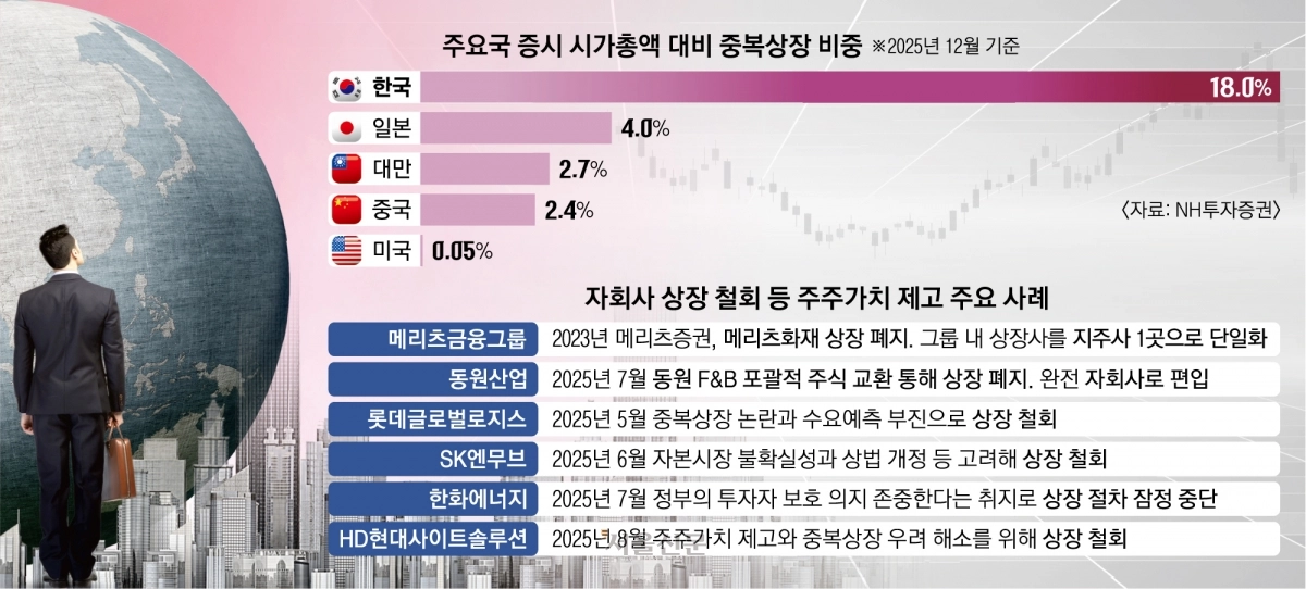 국내 중복상장 비중은 주요국과 비교해 압도적으로 높다. 13일 NH투자증권에 따르면 지난해 12월 기준 국내 증시 시가총액 중 중복상장 기업이 차지하는 비율은 18.0%에 달한다. 일본(4.0%), 미국(0.05%)은 물론 대만(2.7%), 중국(2.4%)보다도 월등히 높다.