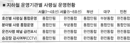 비상벨·인터폰이 제대로 갖춰져 있지 않은 것은 물론이고 재난 비상대응체계가 따로따로 운영되고 있는 것이 큰 문제점으로 지적됐다. 서울지하철의 경우 호선별 사령실과 전력·통신·신호·설비 등 분야별 사령이 통합돼 있지 않았다.