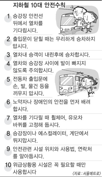 서울메트로는 대구지하철 화재참사 3주기를 맞아 ‘지하철 승객 10대 안전수칙’을 마련,13일 발표했다. 메트로는 지하철 1∼4호선 전동차 내에 안전수칙을 부착해 이용객들에게 홍보해 나갈 계획이다.