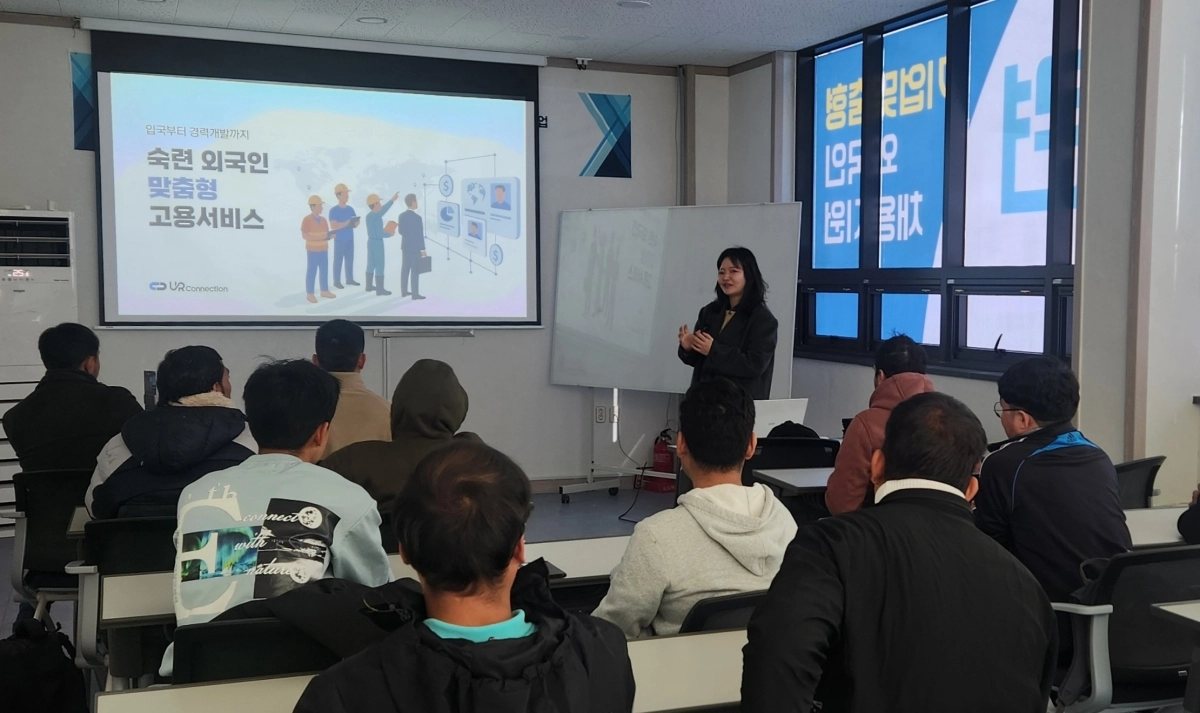 주수민 유알커넥션 대표가 취업을 원하는 외국인 노동자들에게 한국의 직장생활에 대해 강연하고 있다. 경북 경산에 둥지를 튼 유알커넥션은 기업과 외국인 노동자를 연결하는 고용 서비스 플랫폼이다. 유알커넥션 제공