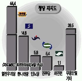 이에 대해 코리아리서치 김정혜 이사는 “부동층이 20%대로 10% 포인트가량 줄어들면서 열린우리당으로 몰린 데다 한나라당과 민주당의 지지층 일부도 이탈했다.”고 분석했다.특히 호남과 충청권에서 열린우리당으로의 ‘표쏠림’ 현상이 두드러진다는 것이다.