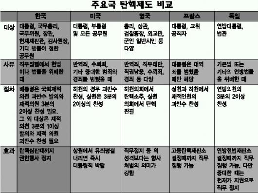 독일의 탄핵 대상은 연방대통령과 법관으로 한정돼 있다.대통령에 대한 탄핵소추권은 연방의회와 연방참사원에게,법관에 대한 탄핵소추권은 연방의회에 주고 있다.반면 모든 탄핵의 재판권은 연방헌법재판소에 주고 있다.모든 탄핵소추권을 의회에 주고,재판권을 헌법재판소에 둔 것은 우리와 비슷하다.
