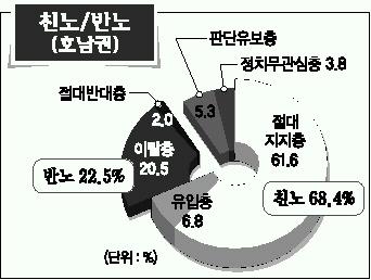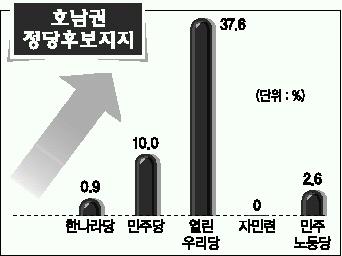 한편 지난 지방선거 당시 호남지역 광역의회 비례대표 선거에서 14.2%라는 높은 지지를 받았던 민주노동당에 대한 지지도가 이번 조사에서는 2.6%에 불과한 것으로 나타났다.
