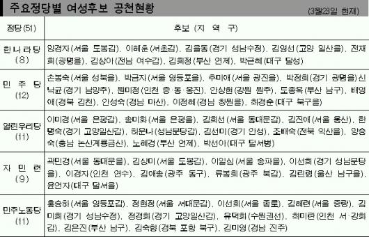 총선을 20여일 남겨둔 23일 현재 한나라당·민주당·열린우리당·자민련·민주노동당에서 전국 243개 지역구에 공천을 확정한 925명 가운데 여성후보는 51명으로 5.5%다.