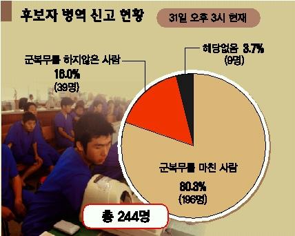 한편 만18세 이상으로 징집대상인 후보자 아들 333명 가운데 55%인 182명은 군복무를 마쳤으나 아예 군대를 가지 않은 병역미필자 비율도 10.0%(33명)나 됐다.한나라당이 12명으로 제일 많았고 이어 열린우리당 8명,자민련 6명,민주당 3명 등의 순이었다.