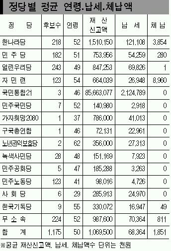 후보 진영에서도 비상이 걸렸다.세금체납과 함께 납부액이 적은 이유를 유권자와 언론에 설명하면서 이해를 구하려는 후보들이 상당수다.이와 관련,세무당국이 고의적인 체납이나 투기의혹 후보들에 대해서는 내사를 해서라도 세원 추적에 적극 나서야 한다는 목소리가 높아지고 있다.1일 후보등록을 잠정마감한 결과,1175명이 등록한 가운데 소득세·재산세·종합토지세 등 3가지 세목(稅目)을 5년간 전혀 내지 않은 ‘0원 후보’가 31명이나 됐다.자민련이 10명,민주노동당·민주당이 각 4명씩이었다.열린우리당은 2명이었다.