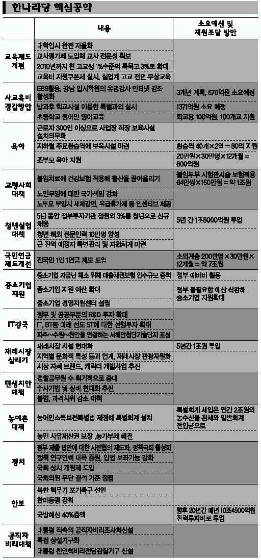 한나라당은 1일 ‘웃음 가득한 가정’‘일할 맛 나는 경제’ 등의 슬로건과 이를 뒷받침할 50개 핵심공약을 발표했다.‘소요예산 및 재원조달 방안’도 함께 제시했다.이는 공약 수행 의지를 내보이겠다는 뜻으로 여겨지며,일부 분야에서는 구체적인 계산법으로 재원조달 계획과 사용처까지 내놨다.