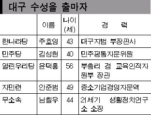 한나라당은 불출마를 선언한 윤영탁 의원 대신 대구지법 부장판사 출신의 주호영 변호사를 공천했다.열린우리당은 대구대 총장을 거쳐,참여정부의 초대 교육부총리를 지낸 윤덕홍 후보를 카드로 내세웠다.두 후보 모두 지역에 기반을 둔 전문직 출신이라는 점도 흥미를 더한다.