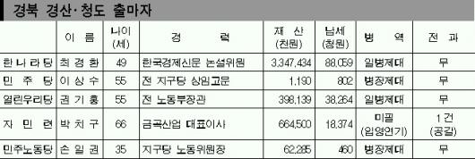 한나라당은 기획예산처와 재정경제원 등을 거친 정통 경제관료 출신의 최경환 후보를 공천했다.열린우리당 권기홍 후보는 노무현 정부에서 노동부장관을 지내다가 지난 2월 ‘총선 올인’ 전략에 차출돼 도전장을 냈다.최 후보는 20년 경제관료 경험을 주무기로 내세우고 있다.당에서는 경제전문가를 자처하는 지역구 후보자들의 모임인 ‘황소경제군단’을 결성,노 대통령 정권이 망쳐버린 경제를 회생하겠다는 각오를 다지고 있다.지역구에 교육·문화·과학이 중심되는 ‘에쿠스 시티’를 건설하고,레저·휴양·의료 기능이 복합된 선진국형 실버타운을 조성한다는 공약을 내걸었다.
