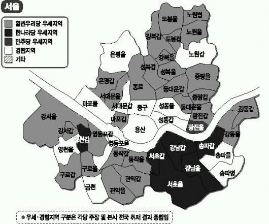 그러나 여론조사 공표가 허용된 마지막 시점인 지난 1일자 조사 기관들의 종합 분석에서 한나라당 확실 우세가 3곳,경합 우세가 2곳에 그쳤던 점과 비교하면 상당한 변화가 일어나고 있음을 감지할 수 있다.한나라당과 열린우리당의 경합지도 8곳으로 늘어났으며,이중 상당수가 한나라당 우세 지역으로 변모할 가능성이 있다.앞서 4곳과 더불어 영등포을(권영세-김종구),마포을(강용석-정청래),금천(강민구-이목희),송파을(박계동-김영술)이 그 대상이다.