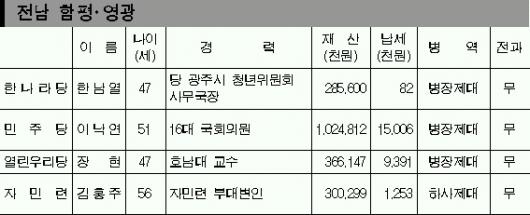 민주당이 열린우리당 열풍에 맞서 텃밭 수성에 사활을 걸고 있는 곳이다.한나라당 한남열 후보와 이 지역의 현역 의원인 민주당 이낙연 후보,열린우리당 장현 후보,자민련 김홍주 후보가 나섰다.이 중 이 후보와 장 후보가 자웅을 겨루고 있다.