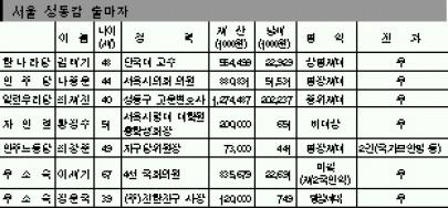 한나라당은 단국대 경제학과 김태기 교수가 나섰다.노사정위원회 특별위원과 한국노사관계학회 이사를 지내온 노동경제 전문가다.한나라당의 경제 전문가 후보로 구성된 ‘황소경제군단’의 일원으로 지역 경제를 일구겠다는 각오다. 열린우리당 최재천 후보는 법무법인 한강의 대표이자 의료사고 전문 변호사다.지난해 김대중 내란음모사건 재심청구 소송을 맡으면서 언론에 많이 오르내렸다.1997년부터 성동구청 고문변호사로 일하는 등 지역사회에 기여했다는 점을 부각시키고 있다.뚝섬을 개발해 관광지로 만들겠다는 각오를 새겼다.