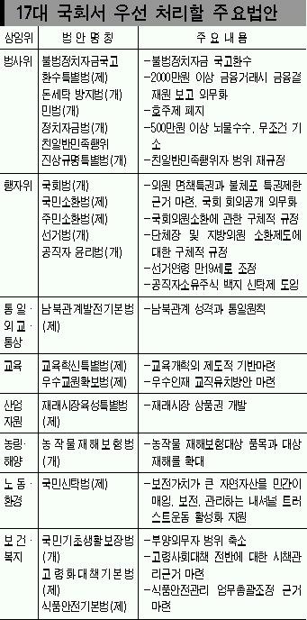 원내 과반수를 확보한 열린우리당이 20일 17대 국회 개원과 함께 우선적으로 처리하려는 50여개 법안들을 정리했다.일부 법안은 한나라당도 크게 반대하지 않아 통과 여지가 크지만 여야간 견해차가 큰 경우도 있다.