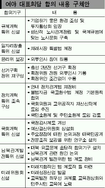 정 의장은 ‘헌법에 명시된 자유민주주의와 시장경제를 바탕으로’라는 문구를 빼자고 했다는 전언이다.북한에 우리 체제를 강요하는 듯한 오해를 줘서 북한을 자극해서는 안된다는 논리를 폈고,“박 대표는 보안법 등 남북문제에 유연한 자세를 보여왔는데 꼭 이 문구가 필요하냐.”고 설득했다.이에 박 대표는 “어떻게 그렇게 생각하나.이는 표현의 문제가 아닌,철학의 문제다.그래야 북한에 더 많이 주더라도 국민들이 불안감을 갖지 않는다.”고 반박했다.양당은 결국 ‘제도화한다.’는 문구를 빼는 선에서 합의했다.