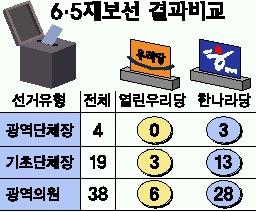 열린우리당은 4명을 뽑는 광역단체장 선거에서 전패(全敗)했다.19명을 선출하는 기초단체장 선거도 거의 완패했다.수도권에선 전멸했고,대전·충남권에서만 3명을 당선시켰다.광역의원 38석 중 6석만을 얻는 데 그쳤다.