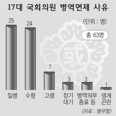 이는 같은 연령대의 일반인 평균 이행률 63.5%보다 12.3% 포인트,16대 의원들의 75.5%보다 0.3% 포인트 각각 높은 수치다.의원들의 병역면제 사유는 질병과 수형이 25명과 24명으로 가장 많고,고령 7명,장기 대기 3명,병역의무 종료 3명,생계곤란 1명이다.병역 면제 의원들을 정당별로 보면 열린우리당이 34명으로 가장 많고,한나라당 23명,민주노동당과 민주당 각 3명 등이다.수형으로 인한 면제자 24명 가운데 20명은 열린우리당 소속이고,3명은 한나라당,1명은 민주노동당 소속이다.