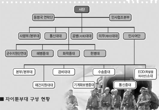 파병부대 규모는 현재 이라크 남부 나시리야에 나가 있는 서희·제마부대원(570여명)을 포함해 3600여명 수준.이라크 주둔 외국군 중 미국(12만여명),영국(8000여명)에 이어 세번째로 규모가 크다.