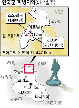 아르빌 공항에서 남서쪽으로 1.5㎞ 떨어진 라스킨에는 사단사령부가 주둔하고,공항 북서쪽으로 30㎞ 떨어진 스와라시에는 1개 민사여단이 주둔한다.두 곳 모두 공항과 가까워 병력 수송과 병참 보급선은 좋은 편이다.해발 400∼1000m의 고원지대지만 여름철인 요즘의 낮기온이 42∼43도까지 올라가 아침 저녁 일교차가 20도 이상이나 된다.선발대 900명은 8월 초부터 중순까지 2∼3차례에 걸쳐 쿠웨이트를 거쳐 현지로 들어간다.해상으로 이동하는 장비·물자도 7월 중순 쿠웨이트 도착을 목표로 출항한다.