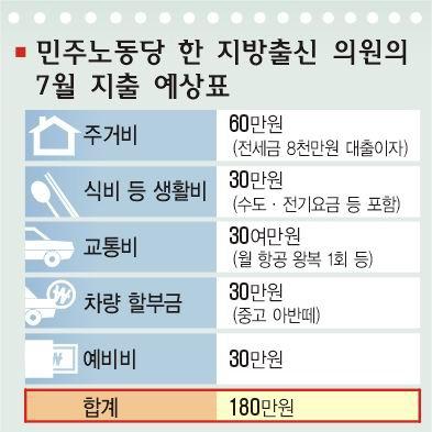 대출 이자만 월 60만원에 달한다.강기갑 의원은 지방출신 보좌관 3명과 함께 강서구 화곡동에 7500만원짜리 전세를 얻었다.이자 부담금 등 생활비는 공동으로 갹출한다.조승수 의원은 대전에서 사업하며 서울을 오가는 고등학교 친구의 여의도 원룸에 ‘얹혀’ 산다.특히 한 달에 한 두번 지역구를 찾는 교통비가 만만찮다.