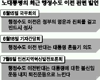 노무현 대통령의 8일 행정수도 이전과 관련한 ‘인천 발언’의 특징은 세가지로 모아진다.첫째는 ‘불신임운동’ ‘퇴진운동’이라는 용어를 사용하면서 노 대통령의 발언 수위가 한층 높아졌다는 점이다.