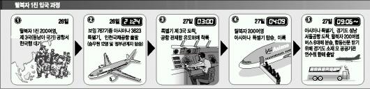 이때부터 정부의 움직임이 빨라졌다.관계기관을 축으로 외교통상부·통일부·국방부·경찰 등 대책반을 구성했다.‘D-데이’는 27일.전세기를 띄우기로 했다.그러나 ‘D-데이’를 불과 며칠 앞두고 탈북단체를 통해 이 사실이 알려지면서 정부는 전전긍긍했다.정부는 이날까지도 입국자 수를 밝히지 않을 정도로 입을 다물었다.한 당국자는 이때부터 “일이 그르칠까봐 걱정된다.”는 말을 입에 달고 살았다.26일 밤 9시24분 특별기가 탈북자 1진 230여명을 태우러 인천 국제공항을 출발,27일 새벽 3시쯤 현지 공항에 도착했다.현장의 분위기는 긴박감이 감돌았다.관계자들은 착륙하자마자 쉴 틈도 없이,대기중이던 탈북자들을 모두 태워 이륙 준비를 마쳤다.이어 오전 4시9분쯤 해당국 공항 관제탑으로부터 이륙허가가 떨어졌다. 5시간10분여의 비행 끝에 특별기는 경기도 성남 서울공항에 내렸다. 탈북자 2진을 태우기 위한 대한항공 특별기 편은 28일 새벽 해당국가로 향할 예정인 것으로 전해졌다.