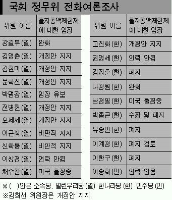 서울신문이 10일 공정거래위를 관할하는 국회 정무위 소속 의원 22명을 전화로 설문조사한 결과,출자총액제한제의 현행 유지에 대해 김희선 위원장을 포함한 열린우리당 의원 6명과 한나라당 고진화 의원 등 모두 7명이 찬성했다.찬성이 절반을 넘지 못했다.