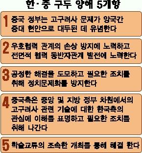 양측은 실질적으로 ▲중앙·지방을 불문하고 정부 차원에서 왜곡을 시도하지 않겠다 ▲중앙 및 지방정부의 출판물에서 더 이상 왜곡은 없다 ▲내년 가을학기에 사용될 초·중·고교 역사교과서 개정과정에서 고구려사 왜곡 내용을 싣지 않겠다는 데 합의했다.