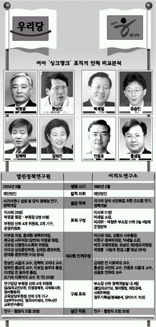열린우리당은 지난 26일 발족한 ‘열린정책연구원’을 통해 이런 구태를 내다버리겠다고 호언하고 있다.원장인 박명광 의원은 “진보성향의 학자는 우리당,보수적 학자는 한나라당의 싱크탱크에 연구위원으로 참여해 정책대결을 벌이고,대선 결과에 따라 그들이 자연스럽게 행정부로 진출하는 시스템을 정착시키고 싶다.”고 말했다.그러면서 미국 민주당 성향의 브루킹스 연구소를 모델로 거론했다.