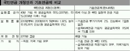 기초연금제는 65세 이상의 모든 국민에게 2인 가구 최저 생계비(2004년 기준 60만 9842원)의 50%를 연금으로 지급한다.반면 정부 개정안은 평균 소득이 있는 사람이 40년 이상 가입할 경우 평균 소득의 60%를 지급하는데 연금의 장기적 재정안정화를 위해 2007년 55%,2008년 50%로 단계적으로 줄이자는 것이다.기초연금제의 재원은 기초 부분과 소득비례 부분으로 나눠 확보한다.먼저 7조원으로 예상되는 기초연금 재원은 부가가치세를 2% 인상해서 국고에서 부담하는 방안을 제시했다.또 현행 소득비례부분의 경우 연기금 재정의 건전성 확보를 위해 보험료율은 현행 9%에서 7%로 2%포인트,급여는 평균소득의 60%에서 20%로 40%포인트 인하키로 했다.정부 개선안은 현재 평균 소득액의 9%에서 2010년부터 5년마다 1.38%씩 높여 15.9%까지 올린다는 방침이다.