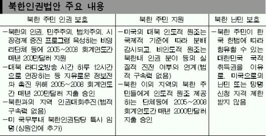북한인권법안에 따라 미 정부는 북한의 인권,민주주의,법치주의,시장경제 증진 프로그램을 육성하는 민간 비영리단체 등에 매년 200만달러를 지원할 수 있다.지원대상은 국적에 관계없기 때문에 미국뿐 아니라 한국의 단체들도 지원금을 신청할 수 있다.