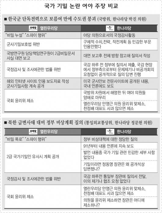 반면 경남대 북한대학원 유길재 교수는 “정치권이 너무 뻔한 이야기를 갖고 싸우고 있다.”면서 “법을 만드는 국회의원은 당연히 기밀보호법을 지켜야 했고,또 정부도 기밀로 분류한 사항은 철저하게 관리해야 했다.”고 밝혔다.