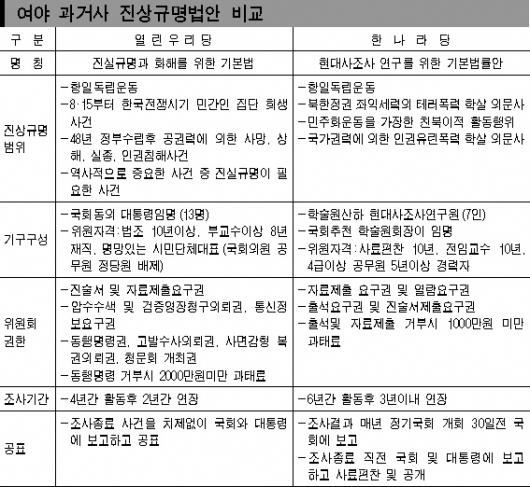 반면,한나라당은 북한정권 및 좌익세력에 의한 테러와 민주화운동을 가장한 친북 이적행위 등을 조사범위에 포함시키자는 입장이어서 앞으로 치열한 논란이 예상된다.