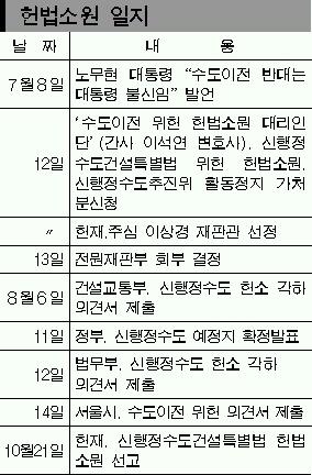 헌법재판소가 수도이전의 위헌 여부를 가려달라는 ‘신행정수도특별법 헌법소원’ 사건을 예상보다 훨씬 빠른 21일 마무리짓기로 한 것은 국론분열의 장기화로 인한 후유증이 클 것이라는 각계의 우려를 받아들인 결정으로 풀이된다.