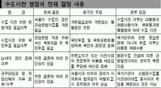 헌재는 수도의 설정과 이전의 의사결정은 국가의 정체성에 관한 기본적인 헌법사항이기 때문에 헌법이 정하는 바에 따라 국민이 스스로 결단해야 한다고 판단했다. 국민투표 없이 수도를 이전하는 것은 효력을 가질 수 없다는 것이다. 수도 이전이 대통령의 재량사항에 해당한다는 정부측 주장을 이같은 이유로 일축했다.