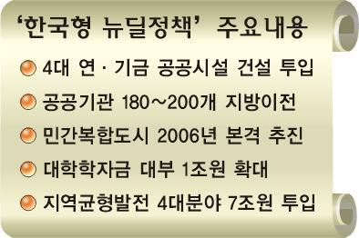 경기 활성화를 위한 ‘한국형 뉴딜’ 정책이 내년 하반기부터 본격 시행된다. 각종 연·기금의 민간부문 투자가 대폭 확대되고, 민간자본 유치를 통한 민·관 합동 투자개발사업도 크게 늘어난다. 민간복합도시(기업도시) 건설을 비롯한 지역균형개발 사업도 2006년부터 본격화한다.