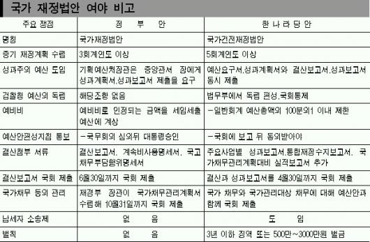 정부 여당이나 야당 모두 지난 1961년 제정한 ‘회계예산법’을 재정 환경의 변화에 따라 손볼 때가 됐다는 데는 공감대를 형성한 것이다. 그러나 한나라당안은 정부안보다 국회의 재정통제권을 한층 더 강화하고 있어 본격 심의 과정에서 치열한 공방전이 예상된다.