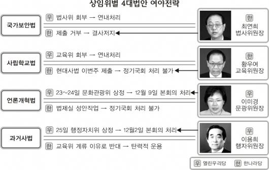 반면 한나라당은 여야 합의없는 상임위 상정을 결사 반대한다는 방침이어서 ‘4대 법안’처리를 두고 남은 정기국회 내내 여야의 치열한 공방이 진행될 전망이다.