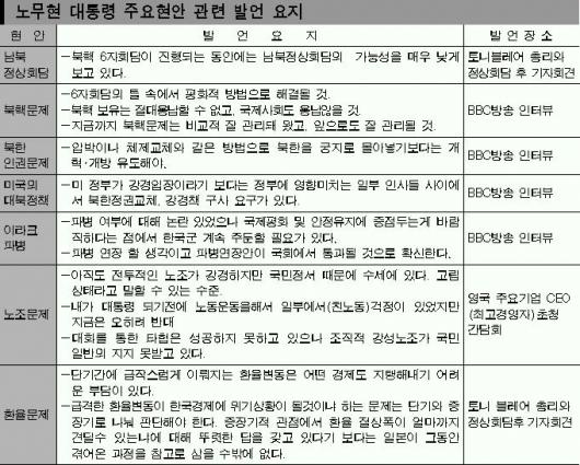 어쨌거나 이런 부정적인 시각은 6자 회담에 전념하겠다는 의지를 반영하고 있는 것으로 풀이된다. 여기에는 6자회담을 통해 북핵문제를 평화적으로 해결할 수 있다는 강한 자신감이 깔려 있다. 노 대통령은 3일 런던시장 주최 만찬에서 “가까운 장래에 북핵문제의 돌파구가 마련될 것”이라고 강조했다. 노 대통령은 블레어 영국 총리와 정상회담에서 미국이 북한에 대한 시각을 바꾸도록 조지 W 부시 대통령에게 중재역할을 요청했다. 한·미공조를 바탕으로 일·러·중과 공동보조를 맞추면서 6자회담의 틀내에서 북핵문제를 해결하겠다는 뜻을 분명히 한 셈이다.