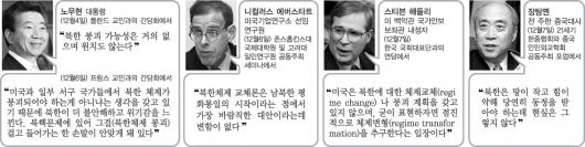 “미국과 일부 서구 국가들이 북한 체제가 무너져야 하는 것 아닌가 하는 생각을 가지고 있기 때문에 북한이 더 불안해하고 있다.”는 노 대통령의 지적에 미국의 일부 네오콘들은 즉각 반응했다. 대표적 ‘북한체제 교체론자’인 니컬러스 에버스타트 미국기업연구소(AEI) 선임연구원은 지난 6일 워싱턴에서 열린 한 세미나에서 “북한체제교체론은 남북한 평화통일의 시작이라는 점에서 가장 바람직한 대안”이라며 포문을 열었다.