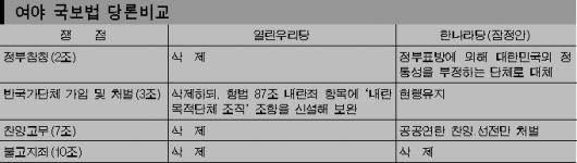 그러나 열린우리당도 국보법 폐지 후 안보 공백은 어떤 형태로든 해소돼야 한다는 데는 이견이 없다. 이를 위해 ‘국토를 참절하거나 국헌을 문란할 목적으로 폭동한 자는 처벌한다.’는 현행 형법 87조 내란죄에 ‘내란목적단체조직’(87조2항) 조항을 신설, 국보법 3조 반국가단체 구성 및 가입행위 처벌 조항을 보완한 것이다. 이에 반해 한나라당은 국보법은 국가 안위를 위한 최소한의 법적 장치로 유지하되, 불고지죄 등 독소조항을 대폭 삭제하거나 개선하자는 입장이다.