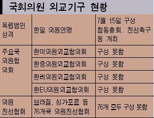 우리 국회가 외국 의회를 상대로 하는 외교단체는 81개로 그 성격에 따라 세 종류로 분류된다. 유일하게 운영되는 ‘한일의원연맹’은 독립법인의 성격으로 183명 의원이 활동하고 있다. 지난달에는 도쿄에서 30차 합동총회를 열어 김포∼오사카, 부산∼하네다 항공 노선 신설과 같은 ‘가벼운 주제’부터 한·일 자유무역협정(FTA), 북핵문제 등 묵직한 이슈도 다뤘다. 나머지 80개 단체는 아직 구성하지도 못해 활동이 전무하다. 미국·중국·러시아·EU 등 4개 주요국을 대상으로 하는 ‘의원외교협의회’나 브라질·인도·싱가포르 등 76개 국가와 맺는 ‘의원친선협회’ 모두 문조차 열지 못했다.