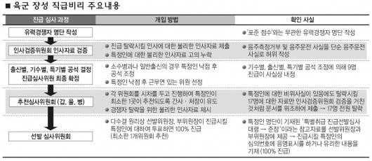 이와 관련, 군 검찰 관계자는 현재 구속상태인 육본 진급계장 차모 중령의 수첩에 “3·15 OO님의 지시라는 표시와 함께 특정인의 이름이 적혀 있었으며 이들은 모두 진급했다.”고 설명한 뒤 “하지만 이를 지시한 OO님이 이번에 기소된 4명에는 포함되지 않았다.”고 말해 지시를 받은 사람만 처벌대상으로 삼았고, 정작 지시자는 처벌에서 제외했음을 시사했다.