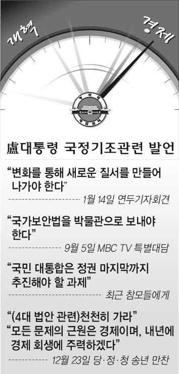 노무현 대통령의 국정운영 기조가 과거에서 현재로 바뀌고 있는 것 같다. 노 대통령의 화두가 지난해엔 불법정치자금, 올해는 과거사 정리였다면 내년에는 민생경제로 전환하는 조짐이 분명해지고 있다.