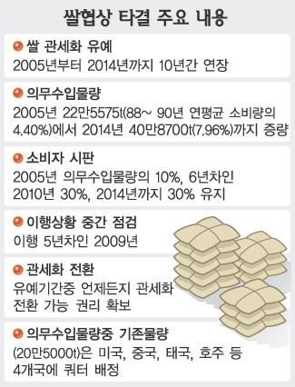 정부는 30일 쌀협상 최종 결과를 발표하고 향후 의무수입량 증량 계획 등을 담은 이행계획서(CS) 수정안을 세계무역기구(WTO)에 통보했다.3개월에 걸친 WTO의 검증이 끝나 최종안이 마련되면 국회에 비준동의를 구할 예정이다. 정부는 관세화 유예 연장의 조건으로 올해 1988∼90년 국내 쌀 소비량 대비 4%(20만 5000t)였던 의무수입물량을 해마다 늘려 2014년에는 7.96%(40만 8700t)까지 확대하기로 협상국들과 최종 합의했다.