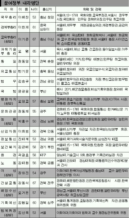 지은희 여성부 장관이 나가고 장하진 여성부 장관과 김선욱 법제처장(장관급) 등 두 명이 입각한 데서 여성 우대 의지와 최초의 여성 법제처장이란 상징성도 읽혀진다. 새 각료의 출신지역이 서울·부산·경남·광주 각 1명과 충남 2명으로 지역 안배 노력의 흔적도 엿보인다. 이번 인사는 노 대통령이 밝힌 ‘땜질 인사’의 수준을 벗어난 참여정부 출범 이후 최대의 개각 폭이다.