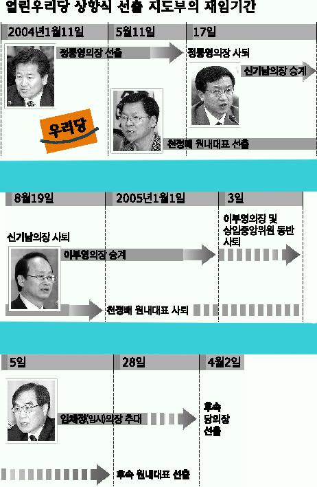 이들뿐 아니다. 전당대회 득표 2위로서 의장직을 자동 승계한 신기남 의장은 두달 만에 부친의 친일 의혹 파문으로 물러났고, 이어 등장한 이부영 의장도 5개월을 채우지 못하고 개혁입법 실패의 책임을 지겠다며 사퇴했다. 나머지 3명의 상임중앙위원도 이 의장과 동반 사퇴했다.2년 동안 당을 이끌겠다면서 당원들에게 표를 호소했던 지도부가 불과 1년도 안 돼 모조리 자리를 내던진 꼴이다.